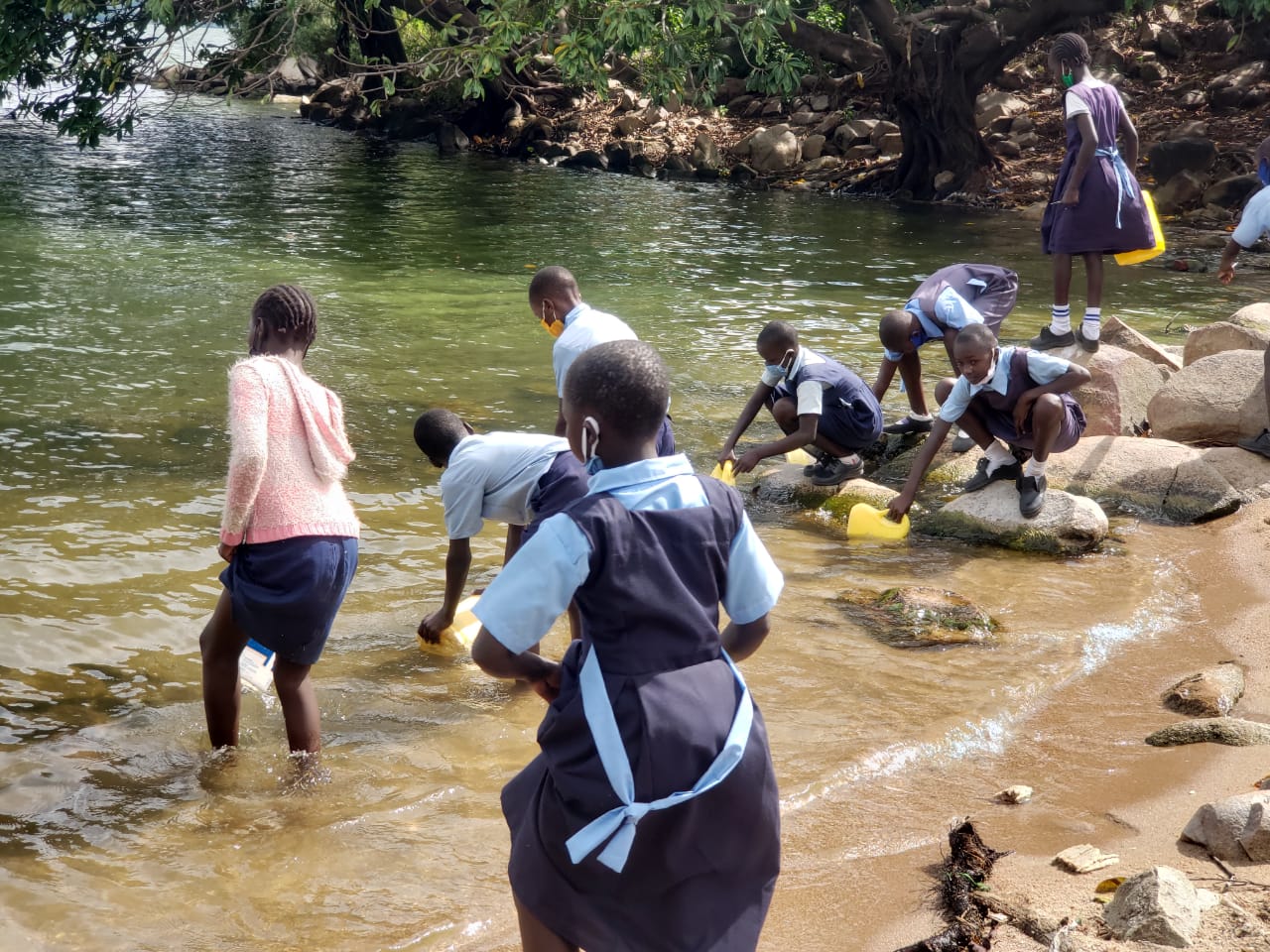 Bambini che in pausa pranzo vanno a prendere l'acqua nel lago Vittoria per bere e per lavarsi